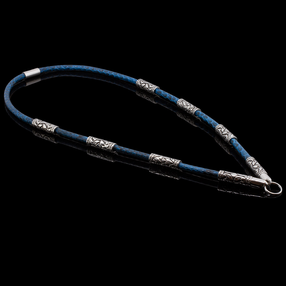 Lion Jewels ægte Python skind Halskæde. Blå rundsyet 6mm ægte Python skind med forsølvede smykkeled. En eksklusiv Halskæde i unikt design. Halskæden er Medium 80 cm med 10 smykkeled.
