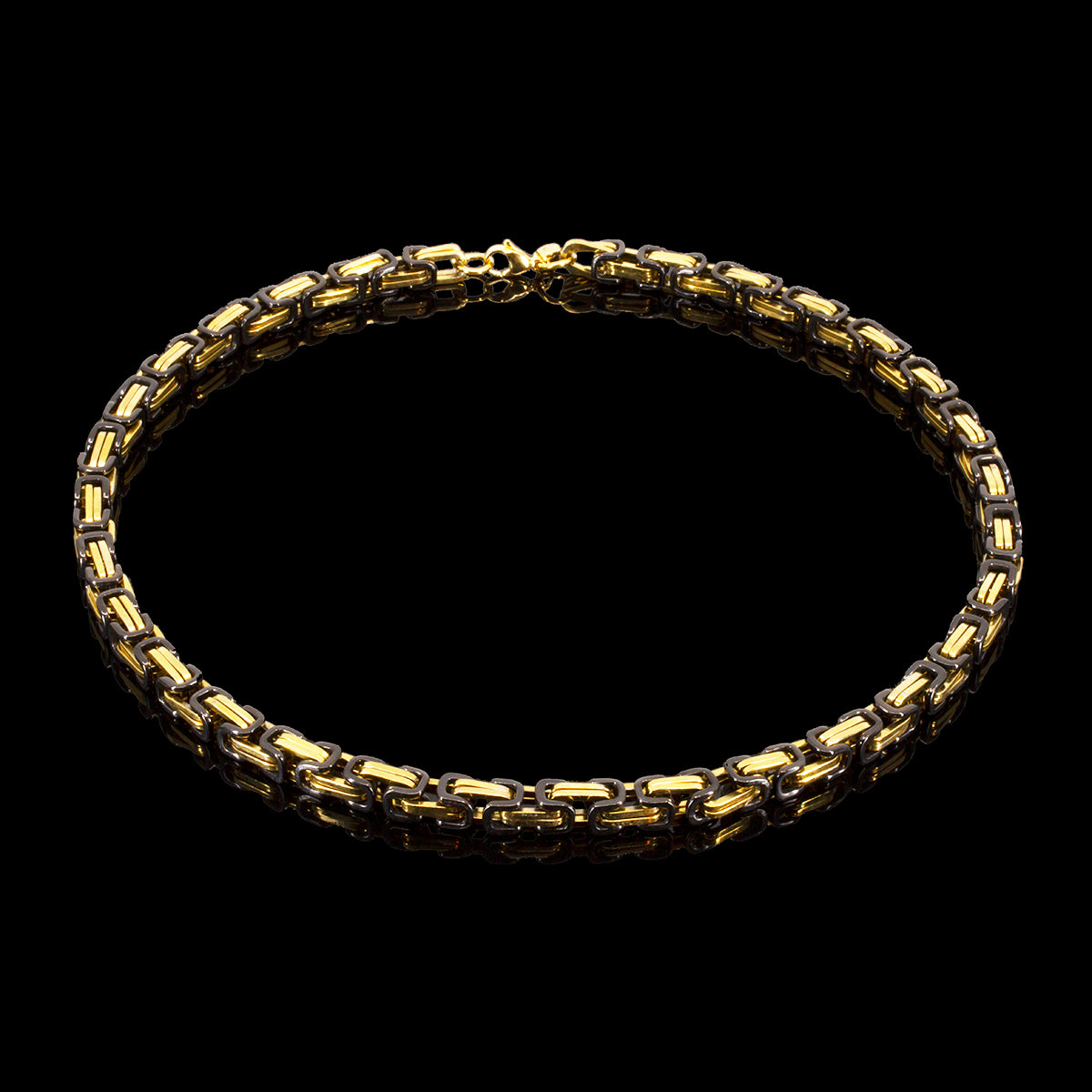 Byzantine eller også kaldet Kongekæde i ædelstål er en meget populær stilart af halskæder, der tilbydes i et holdbart og stilfuldt udseende. Ædelstål giver denne type halskæde en blank, forgyldt finish, kombineret med det sorte look, der er både moderne og tidsløs.
