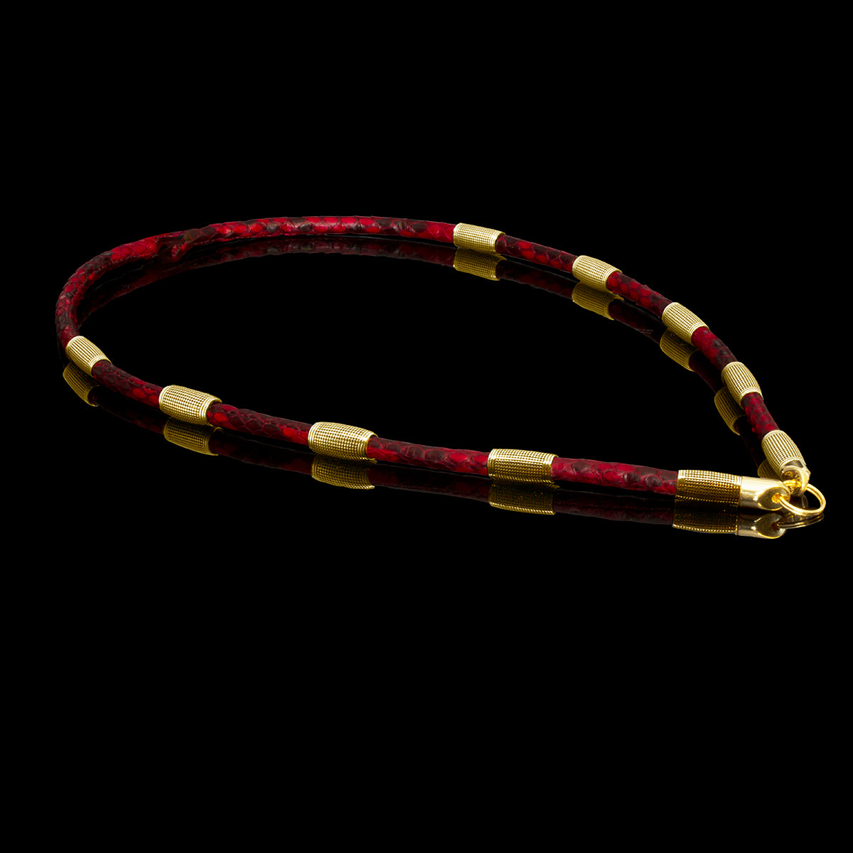 Lion Jewels ægte Python skind Halskæde. Rød rundsyet 8mm ægte Python skind med forgyldte Tønde smykkeled. En eksklusiv Halskæde i unikt design. Halskæden er Medium 80 cm med 10 smykkeled.