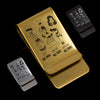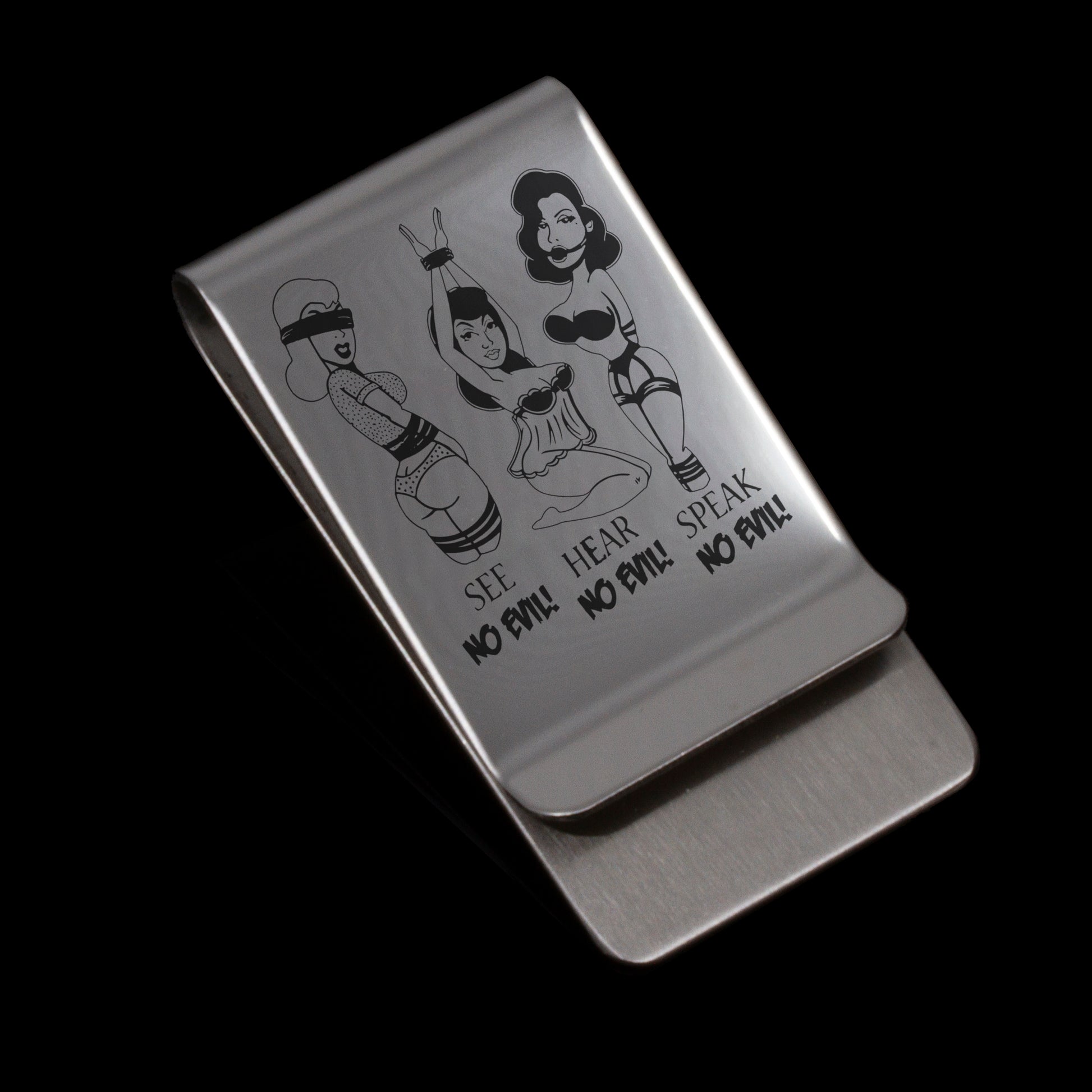 Lion Jewels Pengeclips. Forsølvet Pengeklips graveret med See No Evil, Hear No Evil and Speak No Evil Pin-ups. Kan evt. graveres på bagside. Ønskes dette, så tilføj LJ-1677 for forsidegravering og varenummer LJ-1678 for bagsidegravering i indkøbskurven. Dimensioner: 50 x 25 x 7 mm.